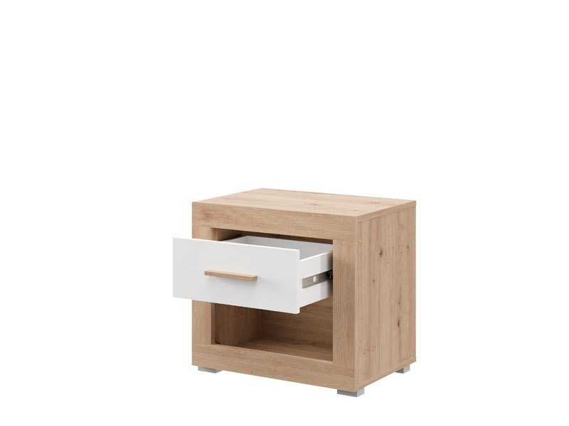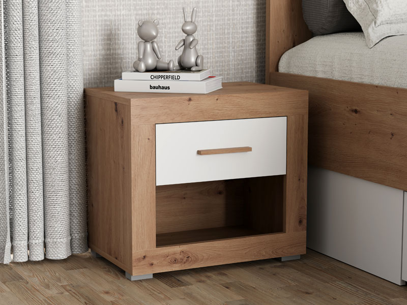 L’espace utilisable de cette table de nuit se compose d’un tiroir et d’une étagère ouverte, permettant un rangement pratique des petits objets et des articles du quotidien.
