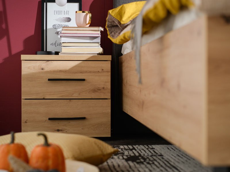 Table de chevet DADO NO2F, au décor chêne artisan, d’une conception très pratique avec deux tiroirs placés verticalement. Elle fait partie fonctionnelle de la chambre et contribue à l'esthétique de l'ambiance.