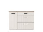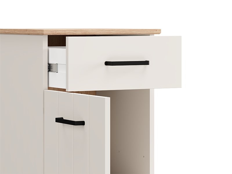 "La table de nuit LAMBETH NO1F1V, fabriquée en combinaison des décors cachemire et chêne artisan, contribue à l’aspect chaleureux et rustique de la chambre à coucher, soulignant la ligne de la conception géométrique clairement définie et les rayures en relief sur les façades.