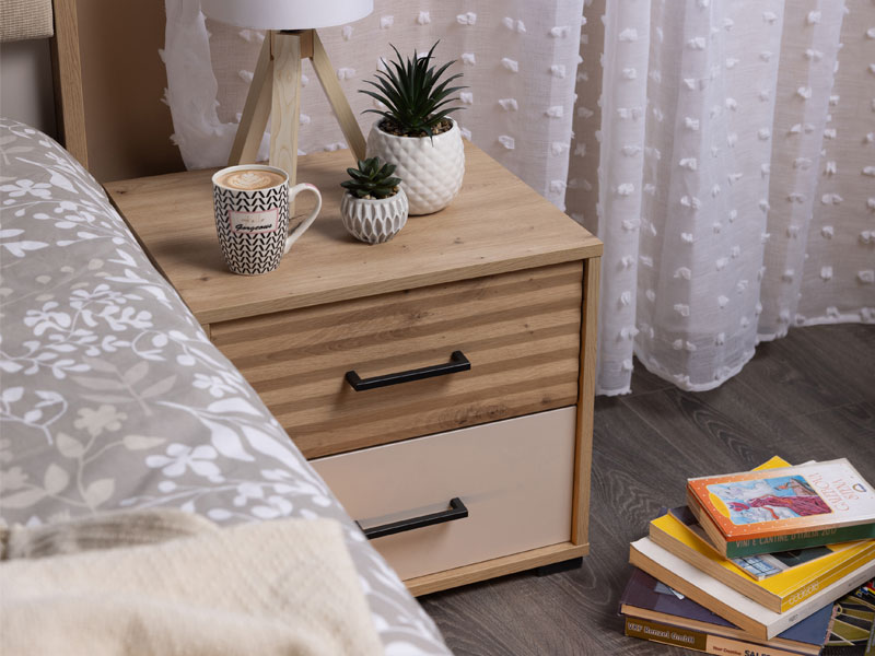 L’espace utilisable de la table de nuit se compose de deux tiroirs pratiques.
