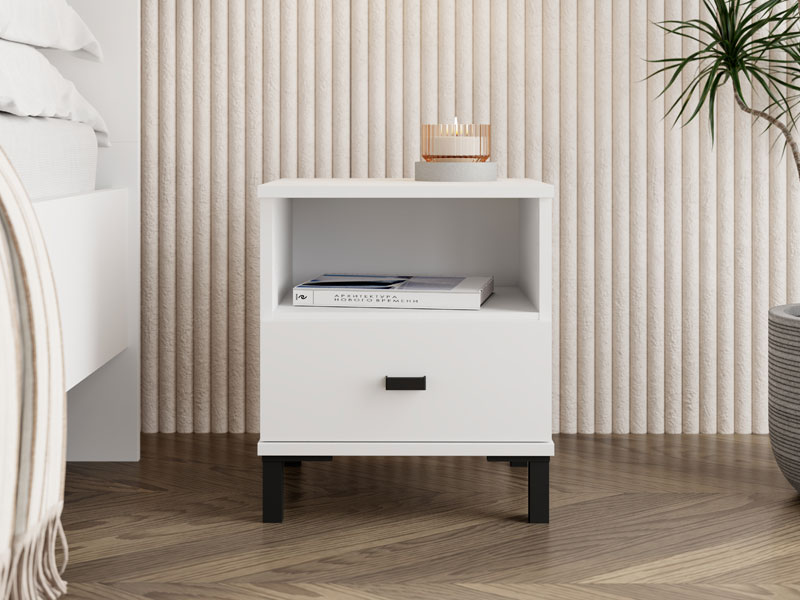 La table de nuit SALAMIS NO1F, fabriquée dans un élégant décor blanc opaque, contribue à l’aspect calme et moderne de la chambre à coucher, tout en offrant un espace fonctionnel et bien organisé à côté du lit.