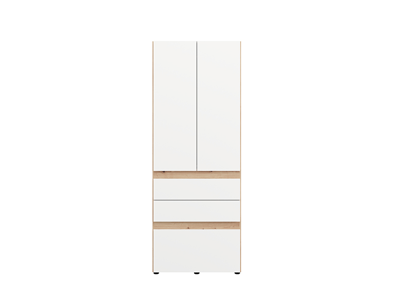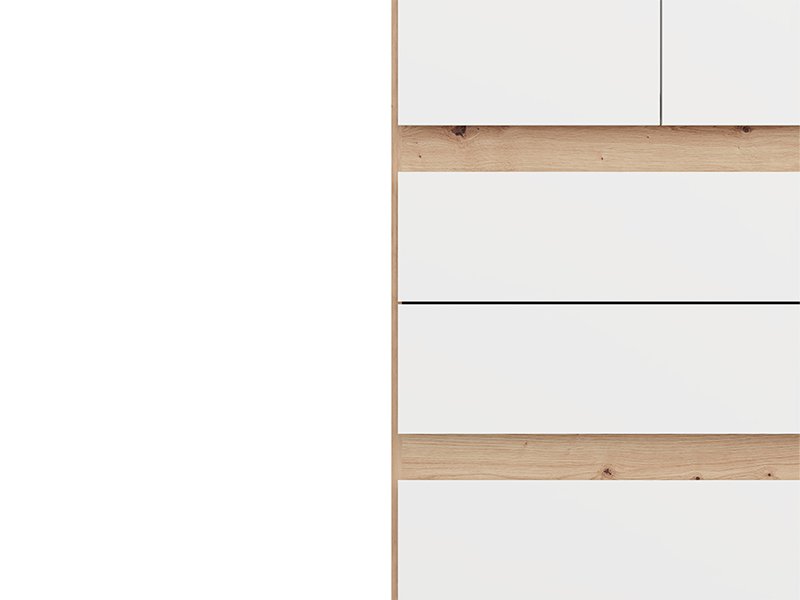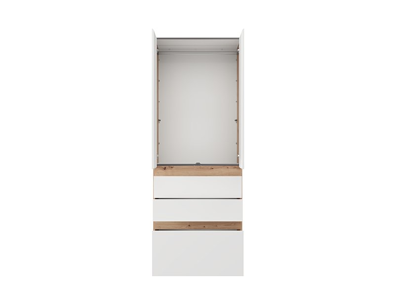 L’armoire ARDERIN 2K3F h207, en combinaison de décor chêne artisan et blanc opaque, est une solution élégante et moderne pour l’organisation des vêtements. Son espace utilisable comprend un segment à double battant avec une barre de garde-robe, sous laquelle se trouvent trois tiroirs - deux peu profonds et un profond, permettant ainsi un rangement clair et pratique des vêtements et des accessoires L’armoire est conçue sans poignées apparentes, soulignant ainsi son style sophistiqué et minimaliste.