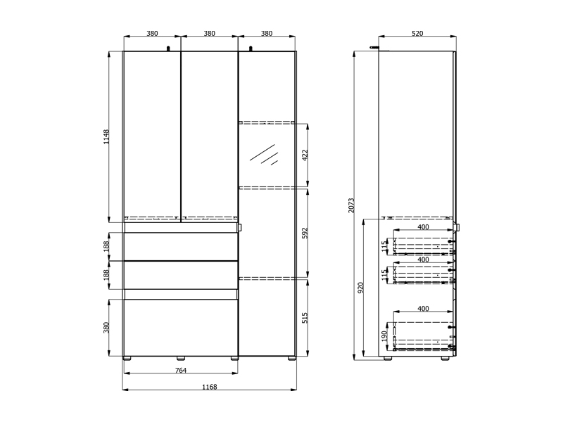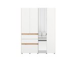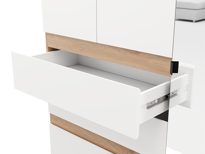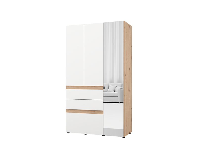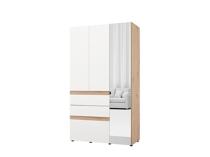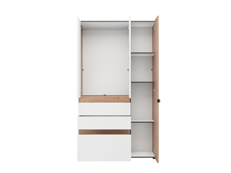 L’armoire ARDERIN 3K3F1O h207, en combinaison de décor chêne artisan et blanc opaque, est une solution élégante et moderne pour le rangement des vêtements. Son espace utilisable comprend un segment à double battant avec une barre de garde-robe, sous laquelle se trouvent trois tiroirs – deux peu profonds et un profond, ainsi qu’un segment cloisonné derrière la façade avec un miroir, permettant ainsi une organisation claire et pratique des vêtements et des accessoires. Il est possible d’ajouter un ensemble d’étagères pour une fonctionnalité supplémentaire de l’espace intérieur.