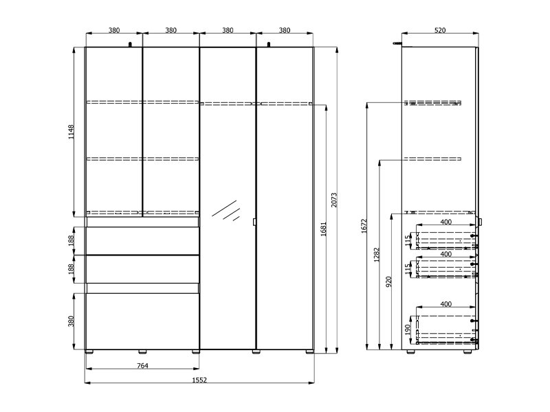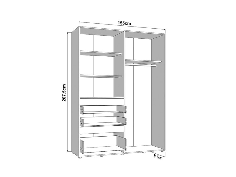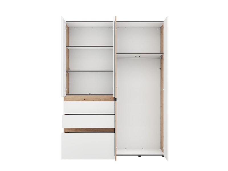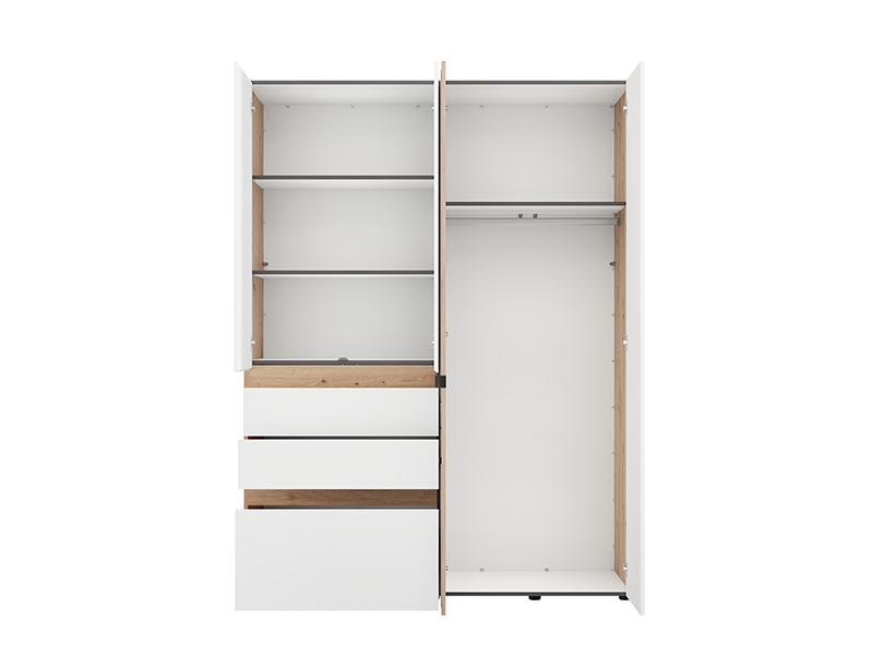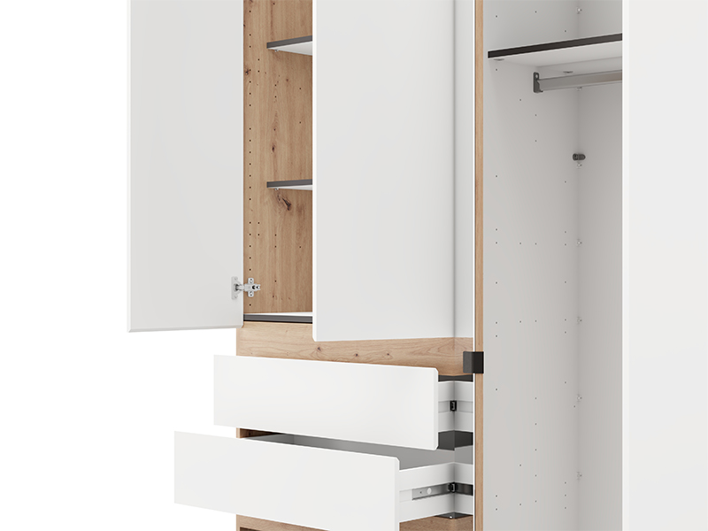 L’armoire ARDERIN 4K3F1O h207, en combinaison de décor chêne artisan et blanc opaque, est une solution élégante et moderne pour l’organisation des vêtements. Son espace utilisable comprend un segment à double battant avec des étagères, sous lequel se trouvent trois tiroirs, et un segment à double battant avec une barre de garde-robe. Un battant de cette armoire à quatre battants est doté d’un miroir, et il est également possible d’ajouter un ensemble d’étagères pour une fonctionnalité supplémentaire de l’espace intérieur.