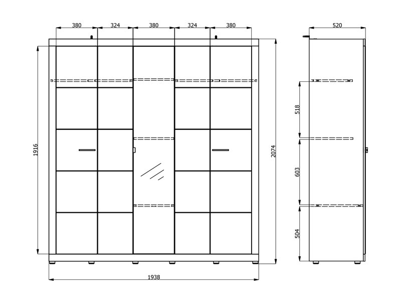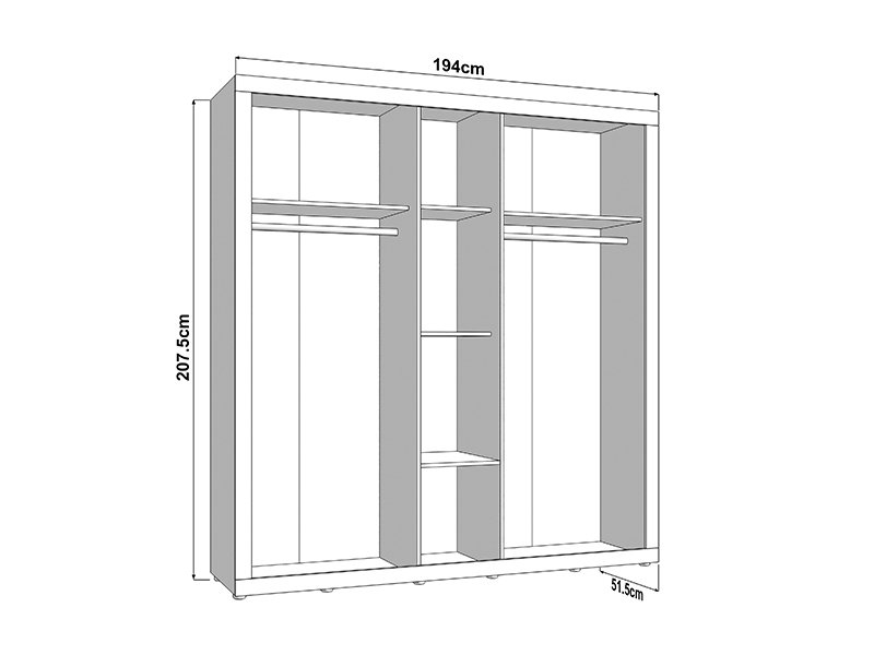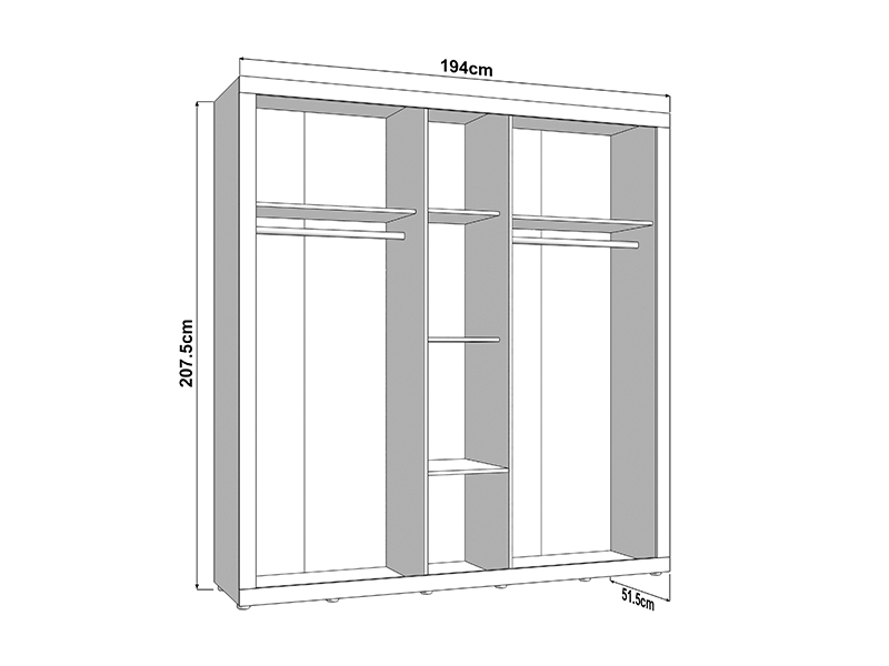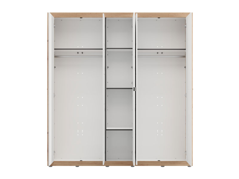 L’espace utilisable de cette armoire à cinq battants est organisé de telle manière que deux parties à double battant comportent une barre de garde-robe, tandis que le segment central est doté des étagères, ce qui permet un rangement clair et pratique des vêtements.