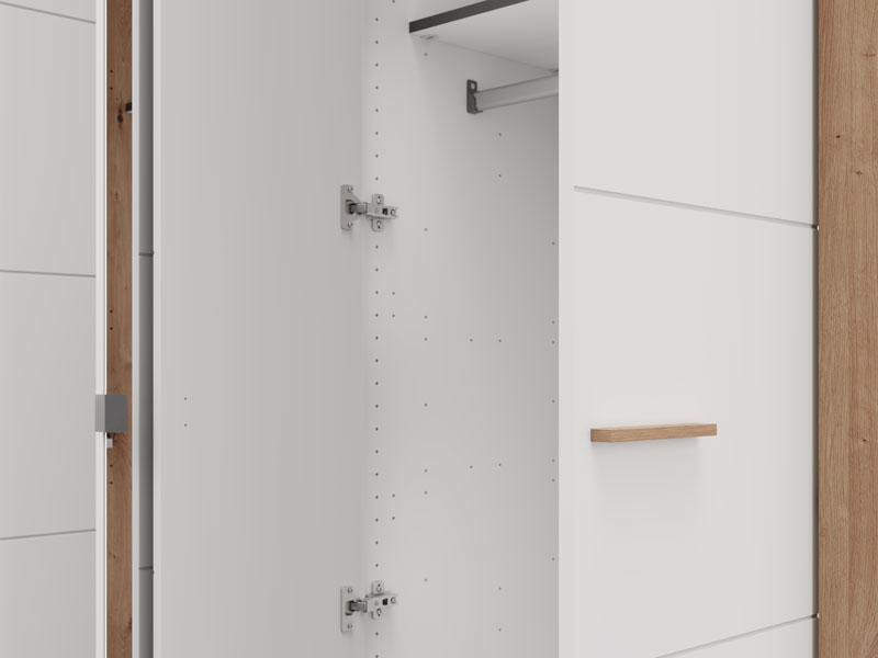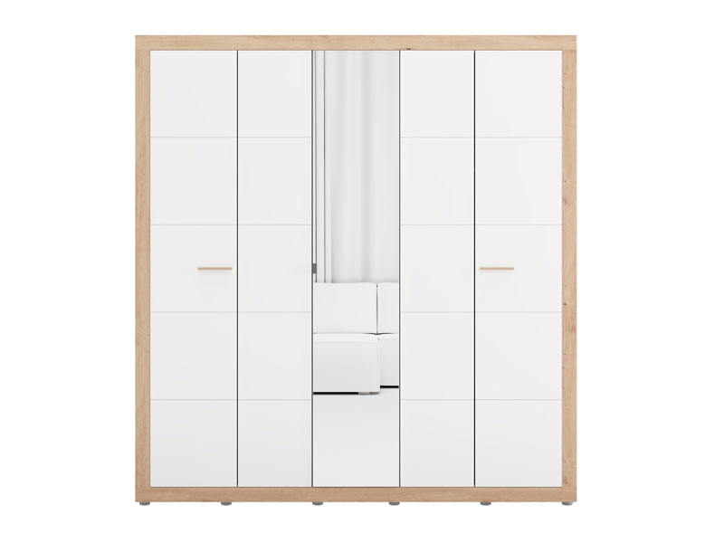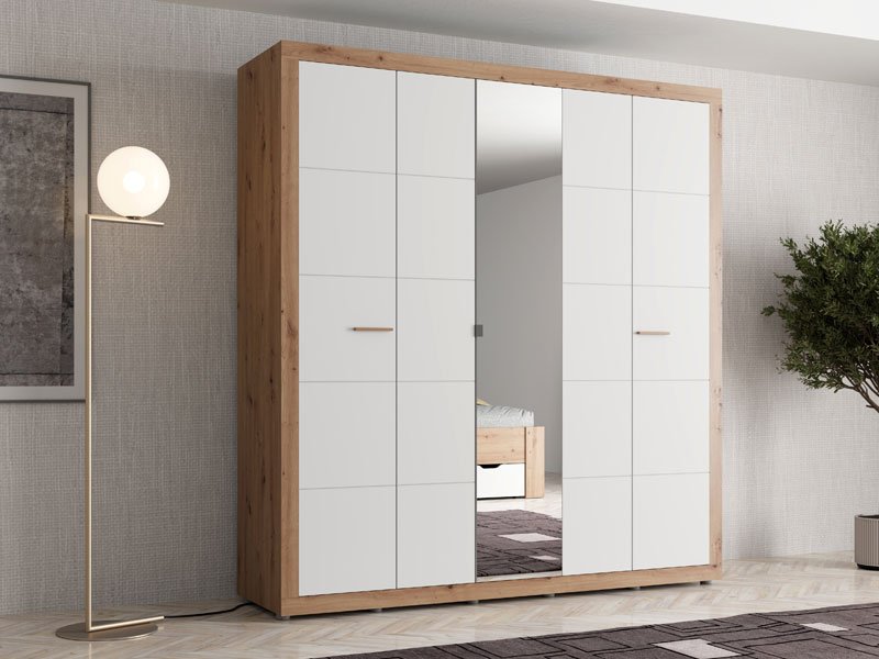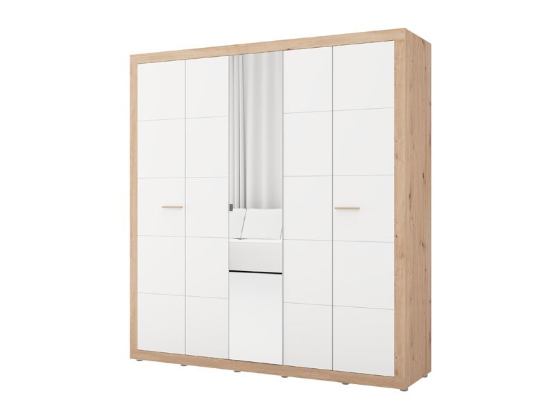 L’armoire CARTENA 5K1O h207, fabriqué en combinaison des décors blanc opaque, chêne artisan et de la feuille chêne artisan, contribue à l’aspect moderne et élégant de la chambre à coucher, tout en soulignant le contraste des matériaux et la forme géométrique précise de la conception. La façade centrale du placard est dotée d’un miroir, qui améliore davantage la fonctionnalité et agrandit visuellement l’espace.