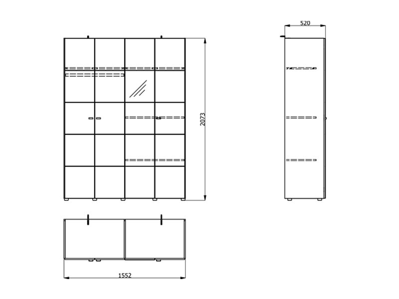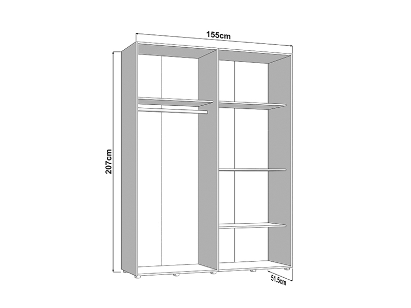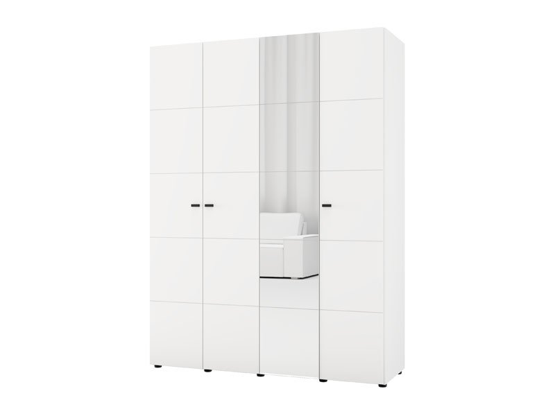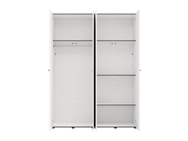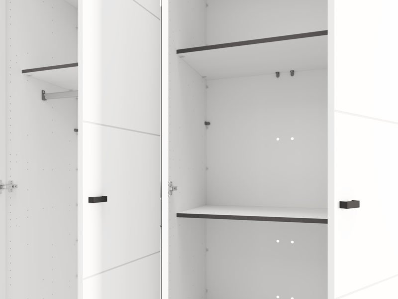 Dans sa configuration de base, l’espace utilisable de cette armoire à quatre battants est organisé en deux parties : une partie à double battant avec une barre de garde-robe pour le rangement des vêtements et une autre partie à double battant avec des étagères, permettant un rangement clair des vêtements et des accessoires. Il est possible d’installer ultérieurement un ensemble d’étagères pour améliorer encore la modularité et l’organisation de l’espace.