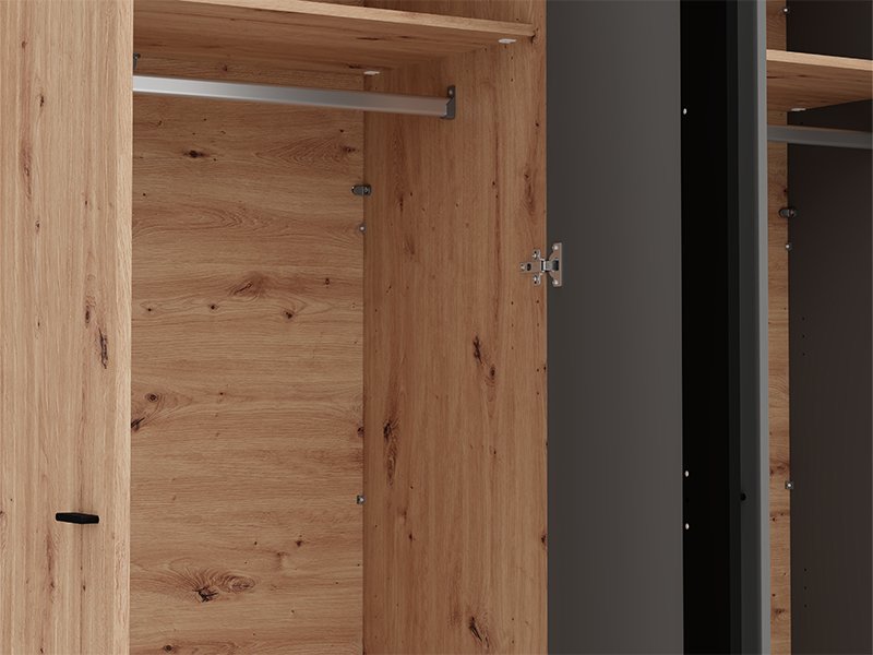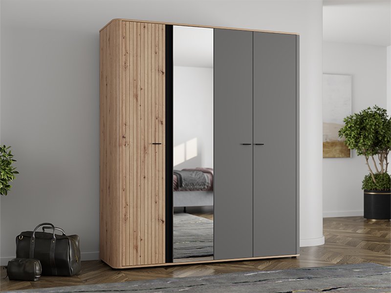 "L’armoire SINOP 4K1O h210, fabriquée en combinaison du décor chêne artisan, de la feuille chêne artisan, des décors gris graphite et bois noir, contribue à l’aspect moderne et sophistiqué de la chambre à coucher, soulignant le contraste des matériaux et la ligne de la conception géométrique clairement définie.