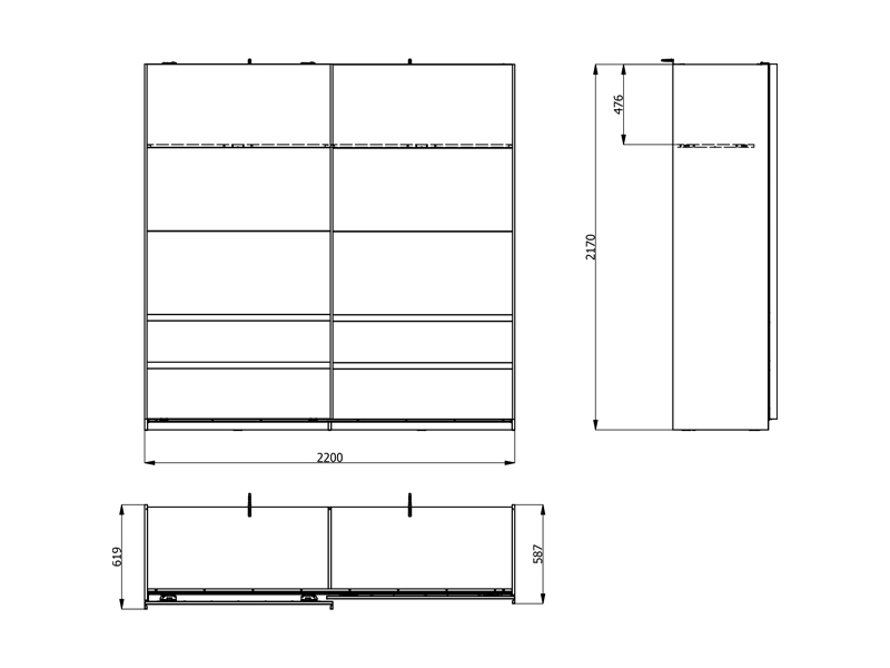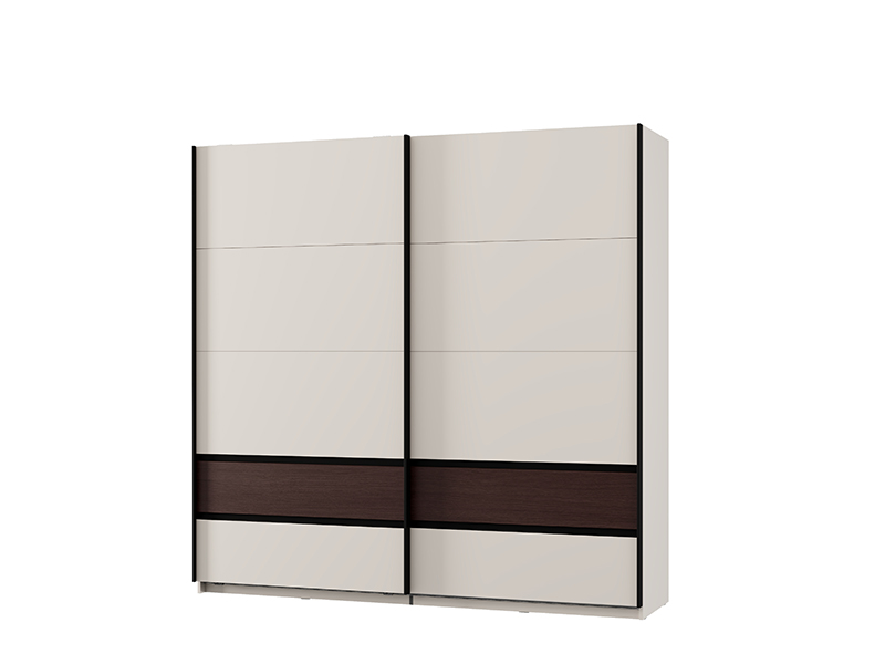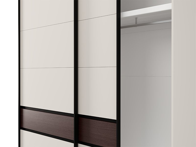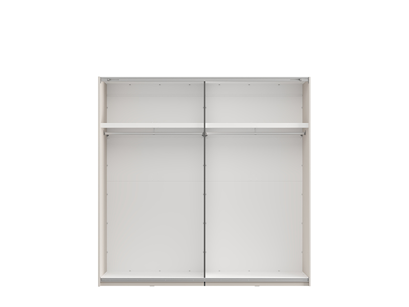 Ce placard dispose de la possibilité d’ajouter ultérieurement un ensemble d’étagères pour le placard, ou des cloisons verticales avec étagères et deux tiroirs, ainsi qu’une seule étagère avec une cloison verticale, assurant ainsi une organisation personnalisée de l’espace et une fonctionnalité maximale. Il est également possible d’ajouter des amortisseurs du mécanisme coulissant et de la structure pour le placard, ainsi qu’un éclairage, ce qui améliore la fonctionnalité et l’impression visuelle de ce meuble.