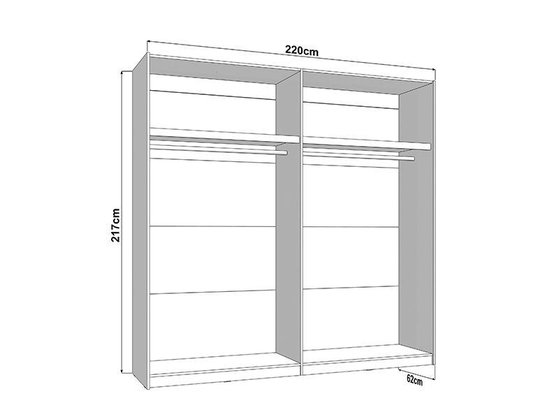 Dans sa configuration de base, l’espace utilisable du placard se compose de deux barres de garde-robe, permettant un rangement clair et fonctionnel des vêtements.