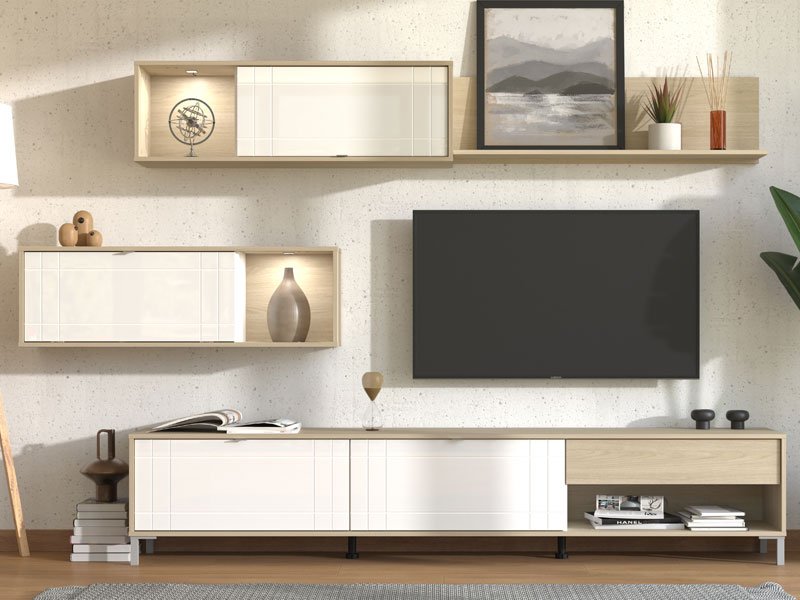 L’étagère CAMBRIDGE en combinaison de décor blanc opaque et décor chêne pédonculé clair, est une solution moderne et fonctionnelle pour l’aménagement du salon. Cette étagère se compose de quatre segments pouvant être disposés dans l’espace selon les besoins, et un avantage particulier constitue la possibilité de poser horizontalement ou verticalement deux éléments muraux. Trois des quatre éléments de l’étagère sont dotés d’étagères ouvertes et de segments cloisonnés fermés. Grâce à la bonne disposition de l’espace utilisable, ainsi qu’à sa conception, elle s'intégrera facilement dans l'ambiance des maisons modernes. Elle dispose de la possibilité d'ajouter un éclairage.