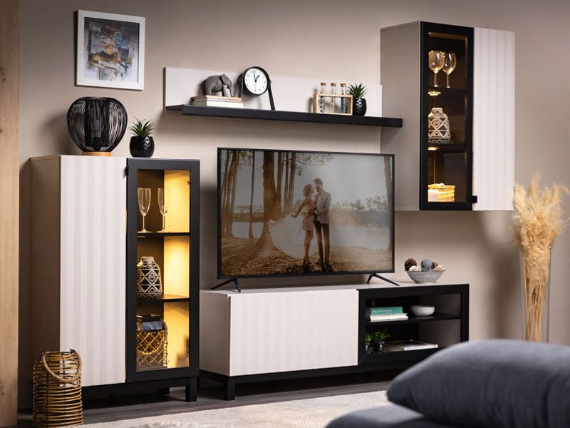 Cu o combinație de decor de cașmir, folie de cașmir, folie neagră și folie neagră mată, raftul MACON a fost conceput pentru a satisface cerințele funcționale și estetice impuse de amenajarea camerei de zi. Raftul MACON vă permite să mobilați în mod practic camera de zi, datorită spațiului util, care constă din rafturi de depozitare deschise și închise, o parte vitrată cu rafturi pentru obiectele de valoare, precum și dintr-o zonă pentru televizor și alte echipamente audio-vizuale. Există posibilitatea de a adăuga elemente de iluminare.