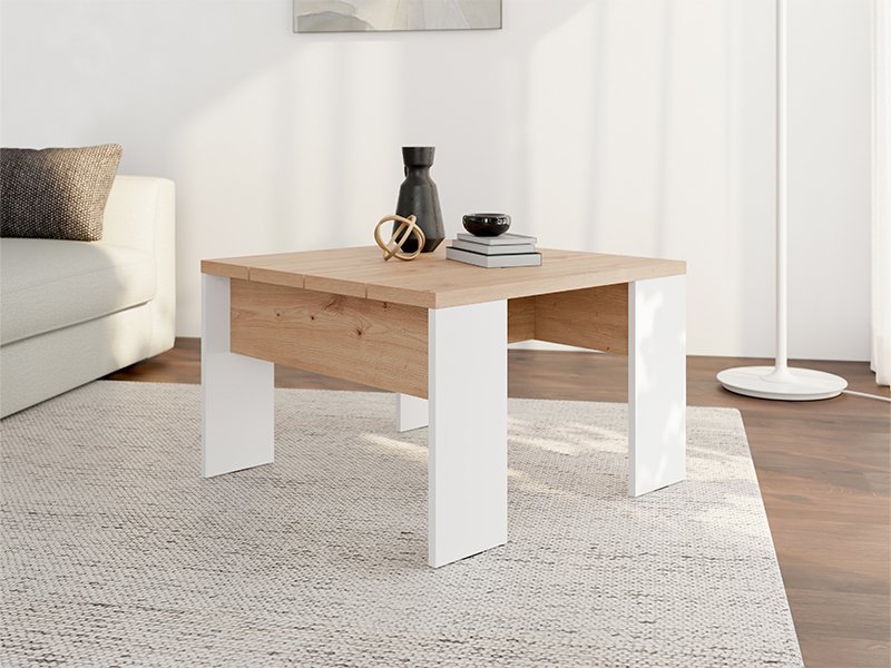 La table basse MONTESE 67x67, ses dimensions pratiques et ses lignes épurées est un choix idéal pour les intérieurs aménagés de manière moderne et minimaliste. Son décor blanc neutre en combinaison avec la chaleur du décor bois s’adapte facilement à différents styles de meubles, tandis que sa conception simple contribue à un aspect rangé et moderne de l’espace.