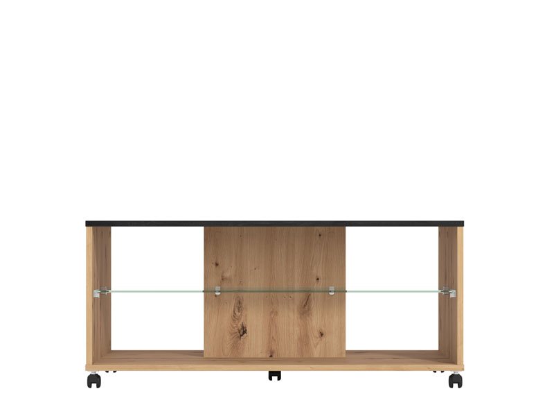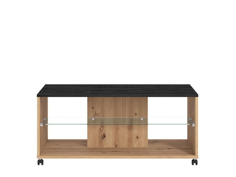 La table basse NORTE KS, en combinaison de décor chêne artisan et carbone, dispose des avantages pratiques et esthétiques. Le détail dominant dans l’apparence de cette table basse est une étagère en verre remarquable au-dessous du plan de travail, idéale pour ranger vos livres ou magazines préférés. La table basse NORTE KS contribue au concept thématique contemporain d’aménagement du salon.