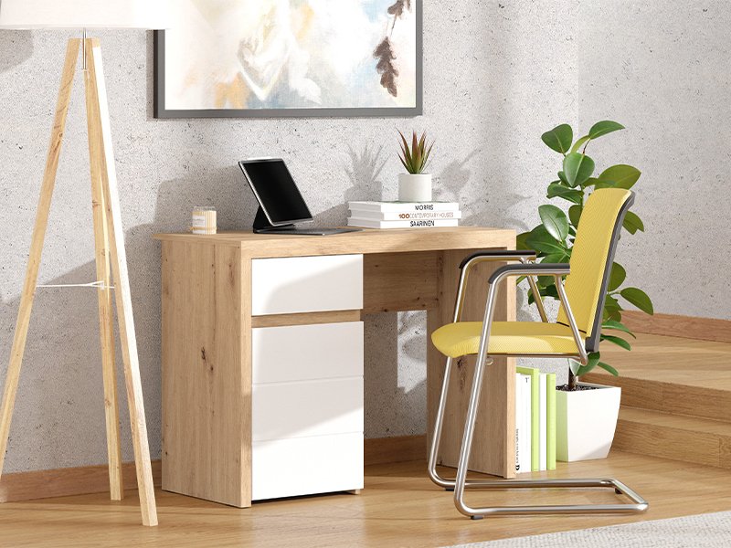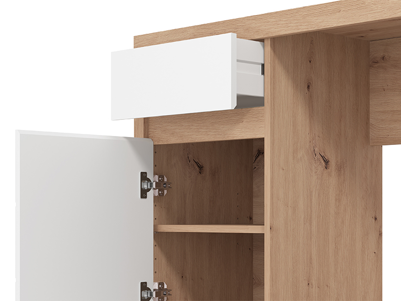 La table d'ordinateur DIOFANT 1F1V LP, en combinaison des décors chêne artisan, blanc opaque et de la feuille chêne artisan, se distingue par une conception moderne et élégante avec des façades sans poignées. Son espace utilisable se compose d’un segment cloisonné fermé et d’un tiroir, permettant un rangement clair et pratique. Grâce à son organisation fonctionnelle et à ses décors esthétiquement coordonnés, la table d'ordinateur DIOFANT 1F1V LP est un élément indispensable pour agencer un espace de travail.