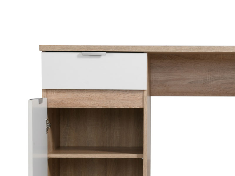 La table ordinateur JAN au dessein chêne sonoma et blanc opaque vous aidera à créer un espace de travail soutenant des résultats optimaux. Ce modèle dispose d’un plan de travail pratique au-dessous duquel se trouvent un tiroir et un segment fermé pour ranger toutes vos affaires importantes.