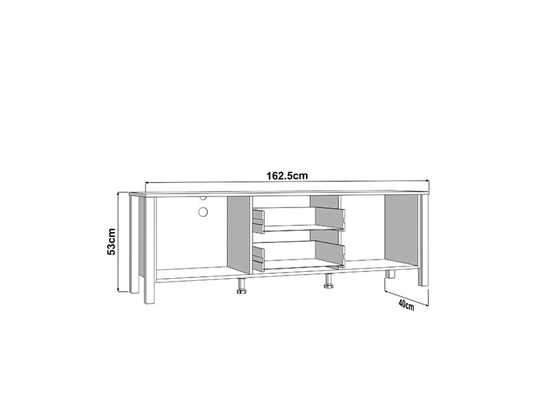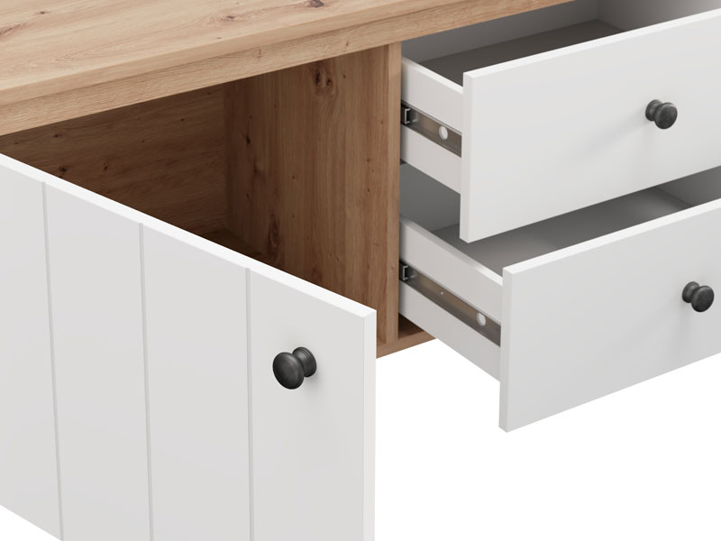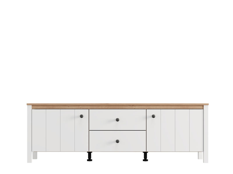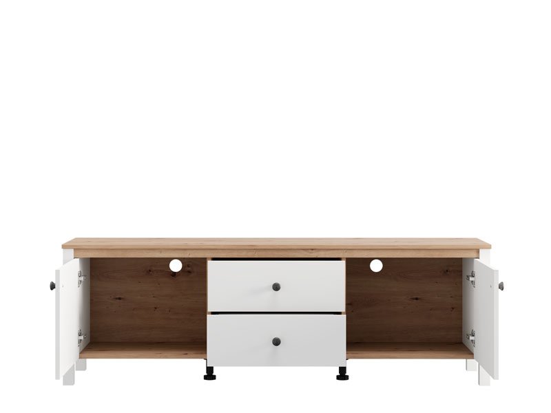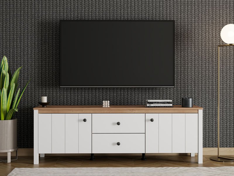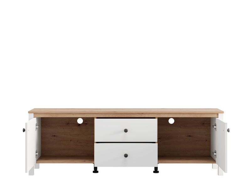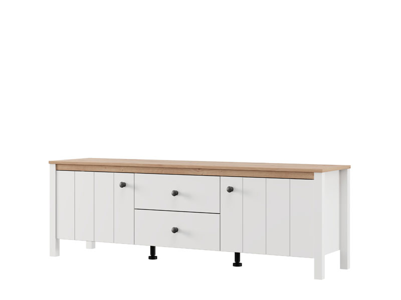L’étagère à télévision BEDFORD TV 162 3K2F2V en combinaison des décors blanc opaque, chêne artisan, de la feuille mate blanche et de la feuille chêne artisan apporte à l’espace la chaleur, l’élégance et le charme naturel. Son espace utilisable se compose de deux segments cloisonnés fermés et de deux tiroirs, permettant un rangement pratique et organisé des appareils multimédias, des livres et des objets décoratifs. L’étagère à télévision BEDFORD TV 162 3K2F2V fait partie du système d’éléments BEDFORD, se distinguant par l’harmonie de l’esthétique rustique et de la conception moderne et fonctionnelle.