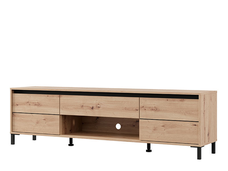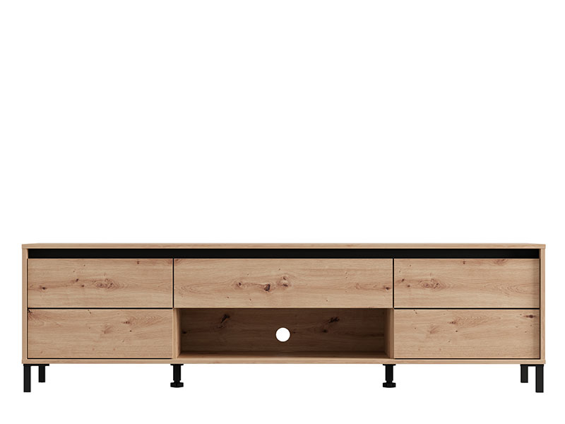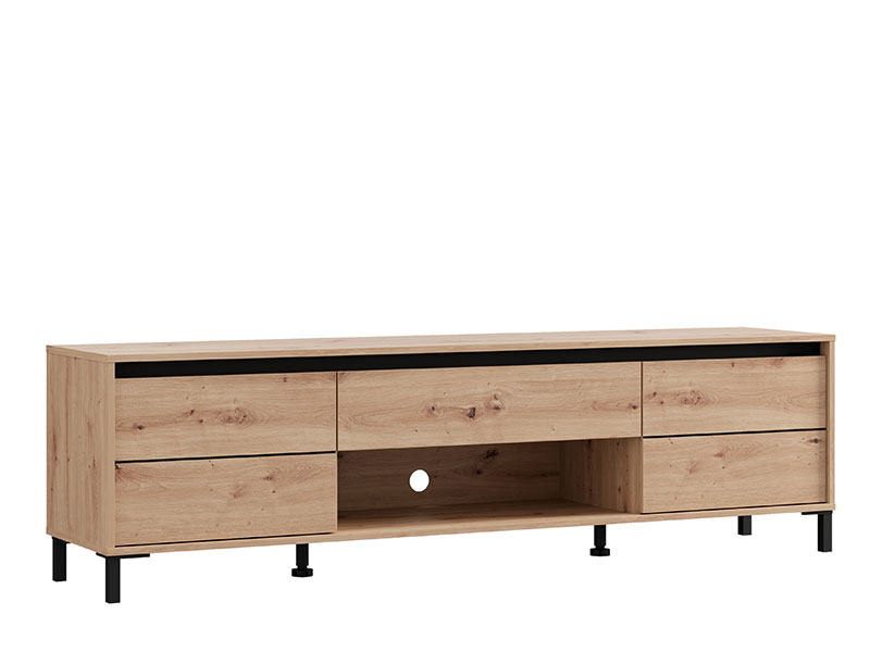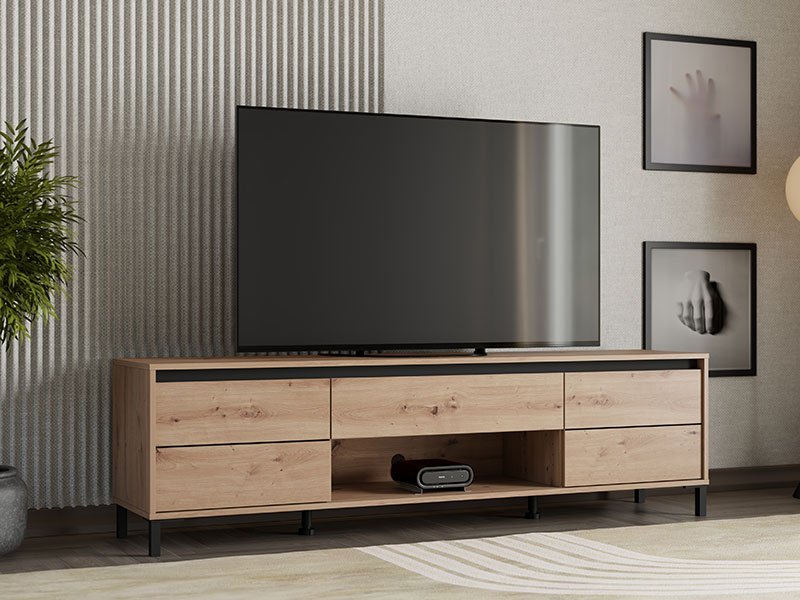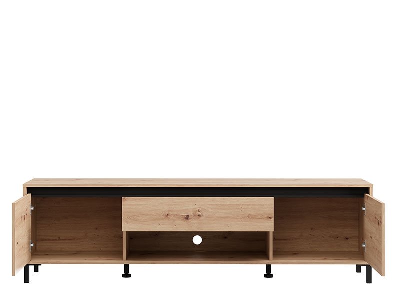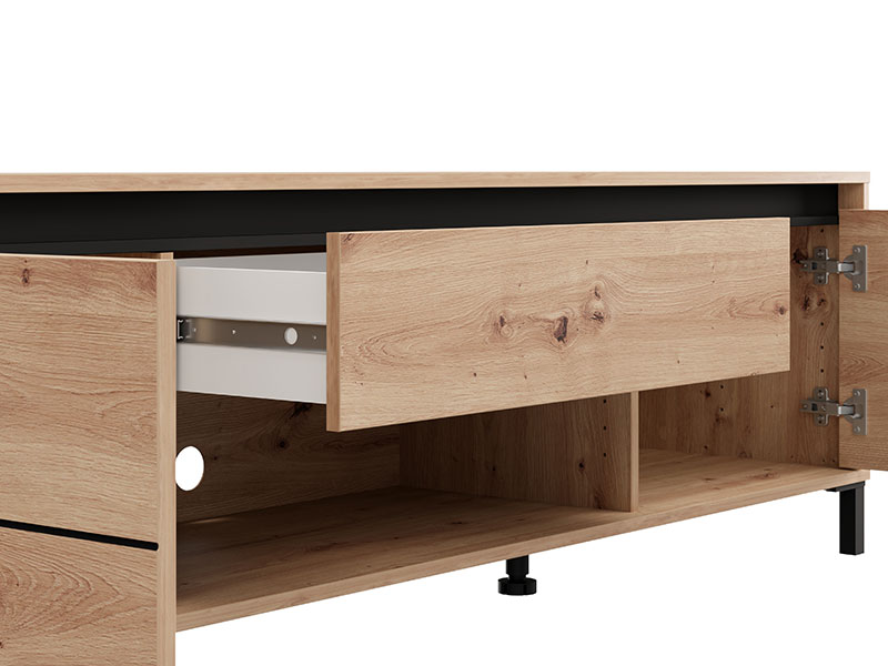 L’étagère à télévision MARRON TV 183 3K1F2V en combinaison du décor chêne artisan et de la feuille matte noire apporte à l’espace une chaleur naturelle et un contraste visuel moderne. Son espace utilisable se compose de deux segments cloisonnés fermés, d’une étagère ouverte et d’un tiroir, permettant un rangement pratique et organisé des appareils multimédias, des livres et des objets décoratifs. L’étagère à télévision MARRON TV 183 3K1F2V fait partie du système d’éléments MARRON, se distinguant par l’harmonie des tons rustiques et la fonctionnalité de la conception moderne.