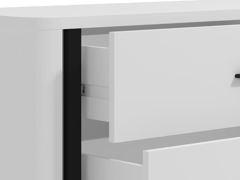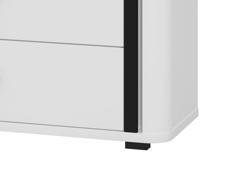 L’étagère à télévision YORK TV 4F est fabriquée en combinaison de décors contrastés, à savoir décor blanc opaque, feuille mate blanche et feuille mate noire et constitue un accessoire fonctionnel pour l’aménagement du salon. Les bords latéraux arrondis et les décors contrastés apportent une esthétique dynamique nécessaire aux intérieurs modernes. L’espace utilisable de cette étagère à télévision se compose de quatre tiroirs contribuant de manière remarquable à l’organisation fonctionnelle du salon.