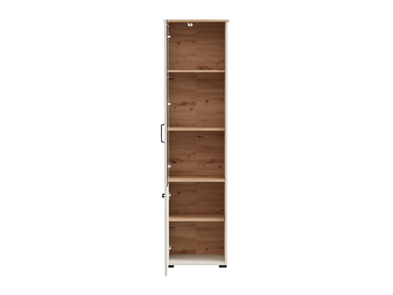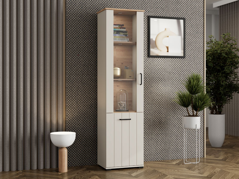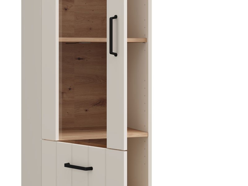 La vitrine LAMBETH 1K VS1 191 en combinaison des décors cachemire et chêne artisan apporte à l’espace la chaleur et le caractère rustique, grâce à sa finition spéciale en forme de rayures en relief sur les façades. Son espace utilisable se compose d’un segment vitré et d’un segment cloisonné fermé, comportant des étagères pratiques pour un rangement organisé des objets d’usage et décoratifs. La vitrine LAMBETH 1K VS1 191 fait partie du système d’éléments LAMBETH, se distinguant par son style et sa fonctionnalité esthétiquement exprimés. Elle dispose d'une option d’éclairage LED supplémentaire, accentuant et illuminant davantage l’espace.