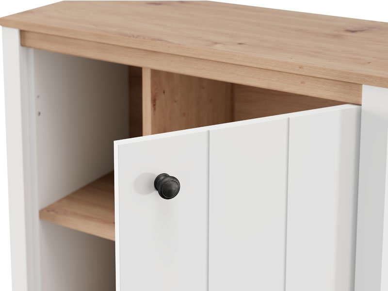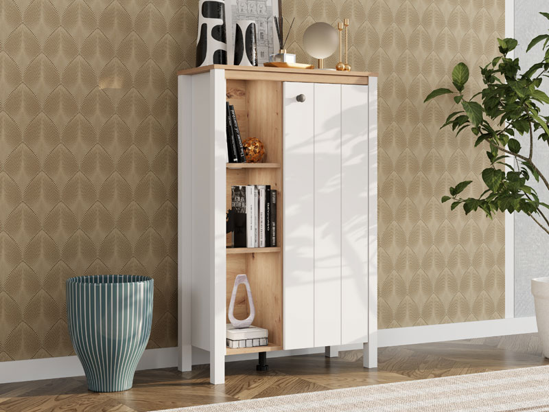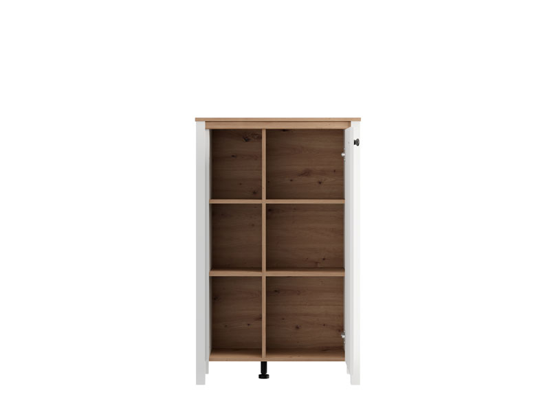 La vitrine BEDFORD 2K1V POP 117 en combinaison des décors blanc opaque, chêne artisan, de la feuille mate blanche et de la feuille chêne artisan apporte à l’espace la chaleur, l’élégance et le charme naturel. Son espace utilisable se compose d’un segment cloisonné fermé et d’un segment doté des étagères ouvertes, qui permettent un rangement pratique et organisé des objets d’usage et décoratifs. La vitrine BEDFORD 2K1V POP 117 fait partie du système d’éléments BEDFORD, se distinguant par la combinaison d’esthétique rustique et de conception moderne et fonctionnelle.